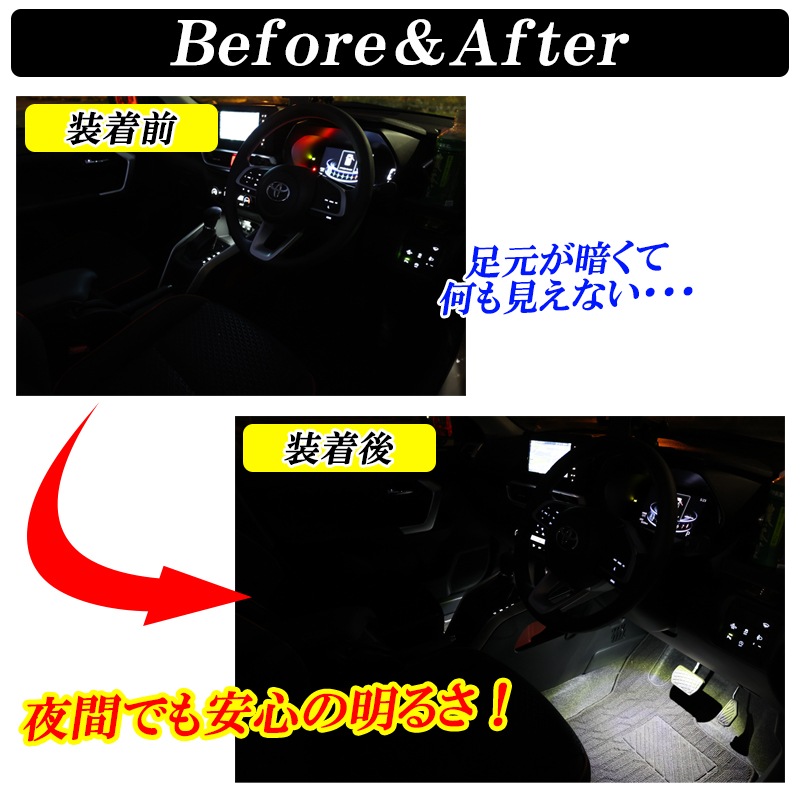 ◆実用性のあるドレスアップカスタム◆ 夜間でも足元を明るく照らしてくれるLEDフットランプ! ドレスアップだけではなく暗い場所の探し物にも困らない! ◆カプラーON!簡単取付◆ 純正カプラーに対応した専用設計なのでカプラーONで取付可能! 複雑な加工や特殊工具は必要ありません! ◆選べる2Color◆ 大人気のホワイトとブルーをご用意しています! 定番の人気色ホワイト発光と個性的でお洒落なブルー発光! |