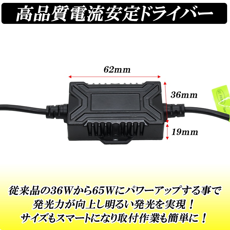 【バルブサイズ】 H8/H11/H16 HB3 HB4 PSX24W PSX26W 【使用用途】 ヘッドライト ハイビーム フォグランプ 【消費電力】 65W 【発光色】 ホワイト 6500K 【明るさ】 12000LM 片側6000LM 【対応電圧】 12V-24V |